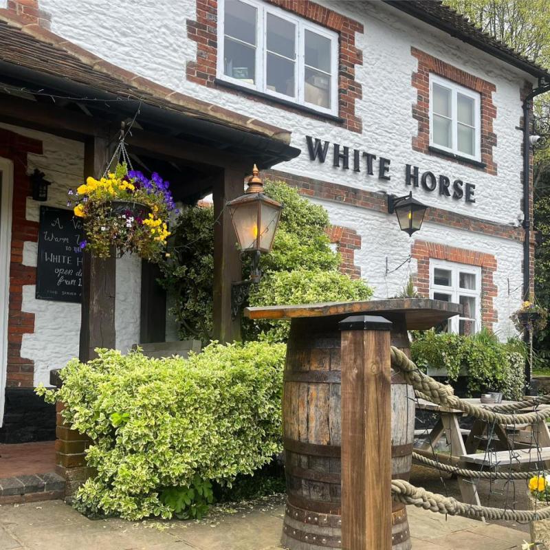 The White Horse is an attractive multiple-award winning 16th century pub in the village of Hascombe nestled in the Surrey Hills area of outstanding natural beauty, just 8 miles from Guildford and at the crossways of numerous footpaths, cycle routes and bridleways including the Greensand Way. A smart community pub with a great range of beers and fresh British seasonal food, where drinkers and eaters alike are looked after with the same friendly and professional service. We serve delicious food all day every day, with quality, seasonal, British ingredients freshly prepared for great flavour. We can’t wait to welcome you for a drink with pals, a business lunch, or dinner with friends and family.