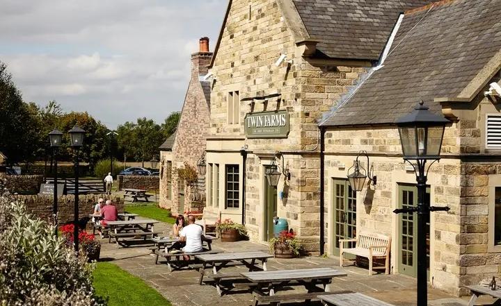 Pub in converted stone farmstead with exposed ceiling beams, for ales and British gastropub menu.
